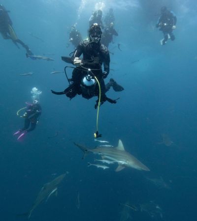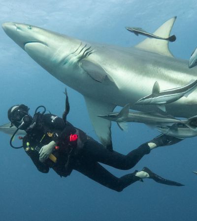 Aliwal’s ultimate adrenaline dive. Get up close with oceanic blacktips, dusky sharks, and tiger sharks (seasonal), zambezi drawn to the bait drum.